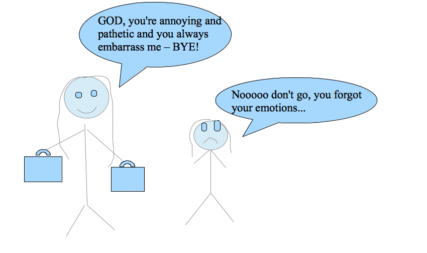 When you have emotions as intense as those of a borderline, its not hard to see why you’d abandon them. They’re the reason people (horrible people anyway) attack you. They’re the reason you can’t live up to the expectations you’ve set for yourself – or that other people have set for you. They’re the reason you feel weak, stupid, abnormal, ashamed and vulnerable. You start to think that the people who invalidate you are right – after all, who would want to put up with someone so contrary, so needy, so difficult to control? As a result, the older I got, the more I separated from the parts of me I couldn’t handle.
